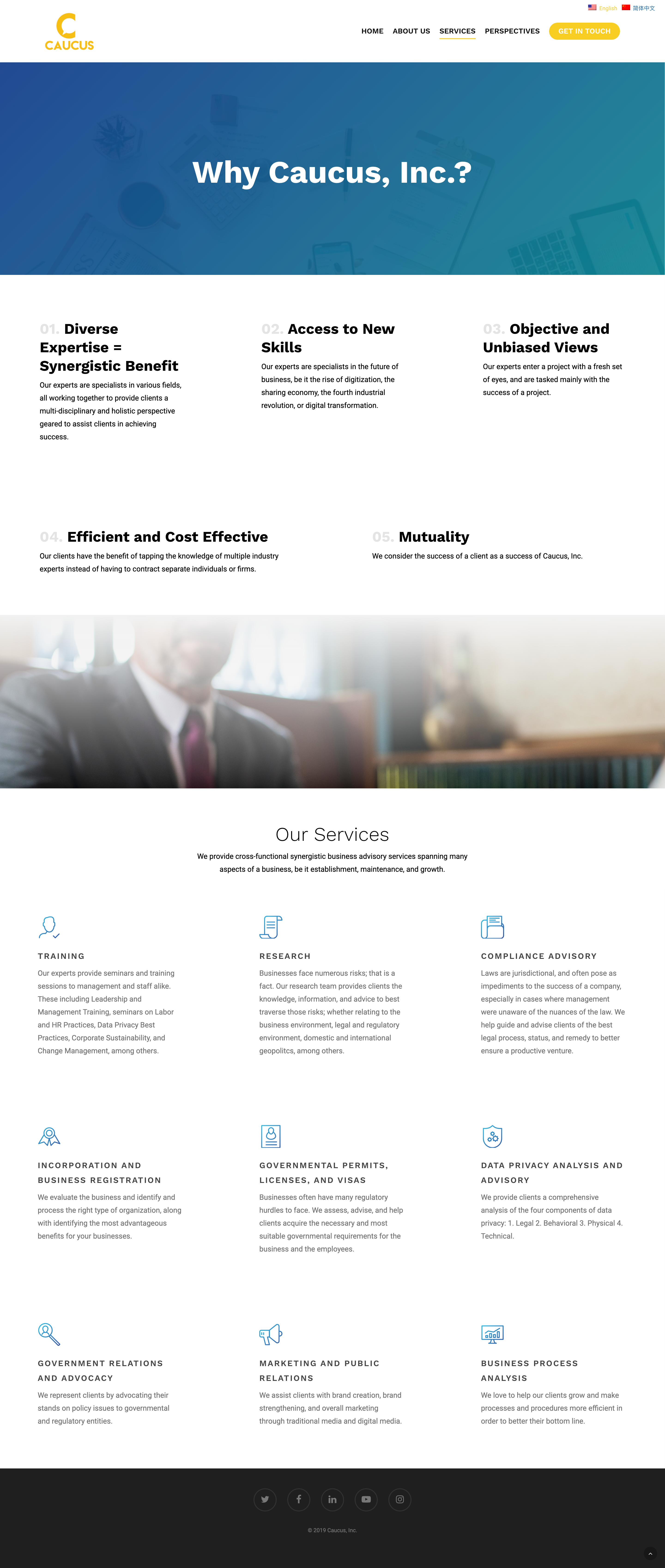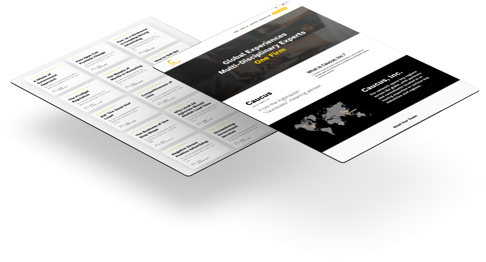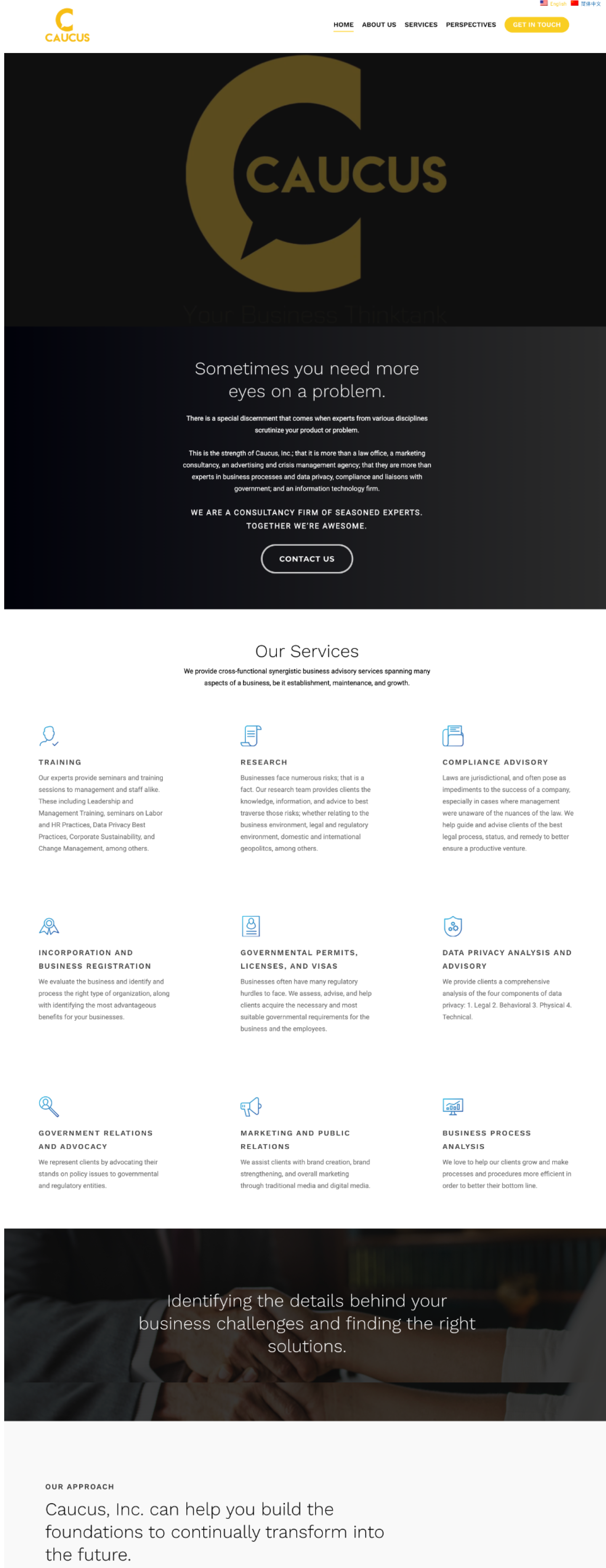 In the age of digital, a website for an entity that aims to reach a target audience is a de facto essential. As palpable as it was to pinpoint what Caucus, Inc. needed—a online presence— the challenge was to build a digital platform from scratch, not to mention one that conveyed their unique and multi-faceted business approach.